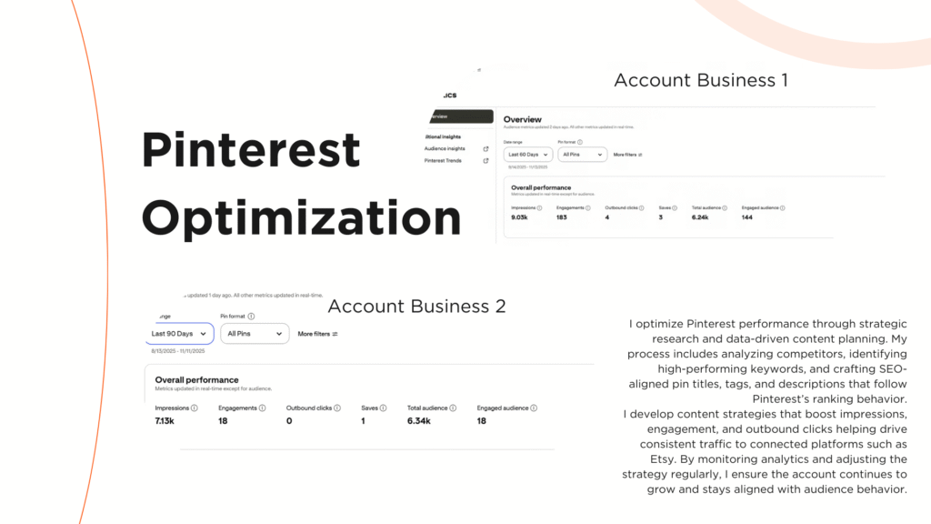 A 30-day trial program to help you improve your Etsy/eBay store through SEO audit, competitor research, optimized titles/descriptions, thumbnail recommendations, Pinterest indexing, and email marketing setup – ALL JUST FOR $100.